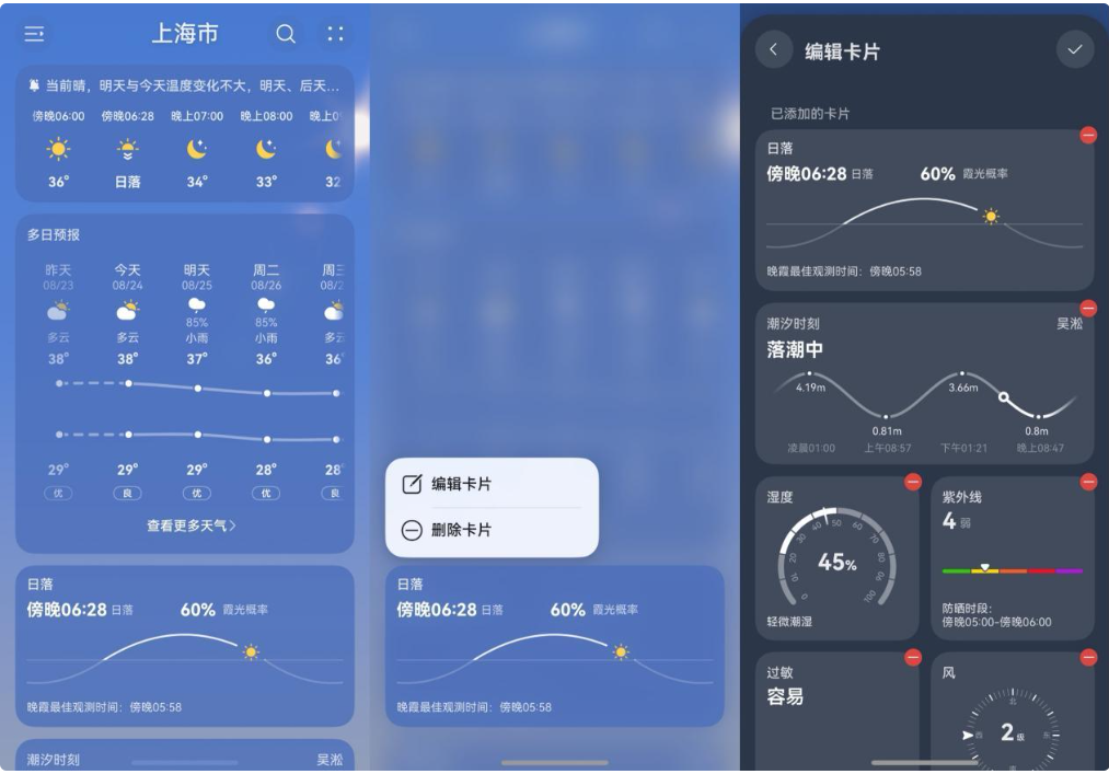 操作非常简便,打开华为天气,首页下滑就能看到日出日落卡片,点击即可查看详细信息。更贴心的是,首页天气卡片现在支持DIY顺序,只需把App升级为最新版本,长按卡片,进入编辑模式,把日出日落卡片放在最显眼的位置,随时查看,再也不怕错过浪漫时刻。