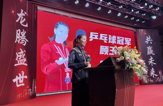 首届乒乓球青奥会女单冠军、乒乓球全国冠军顾玉婷上台致辞。现场洋溢着欢笑声和祝福,每个人的脸上都挂着满足和幸福的笑容,共同庆祝这一年的辛勤工作和成就。