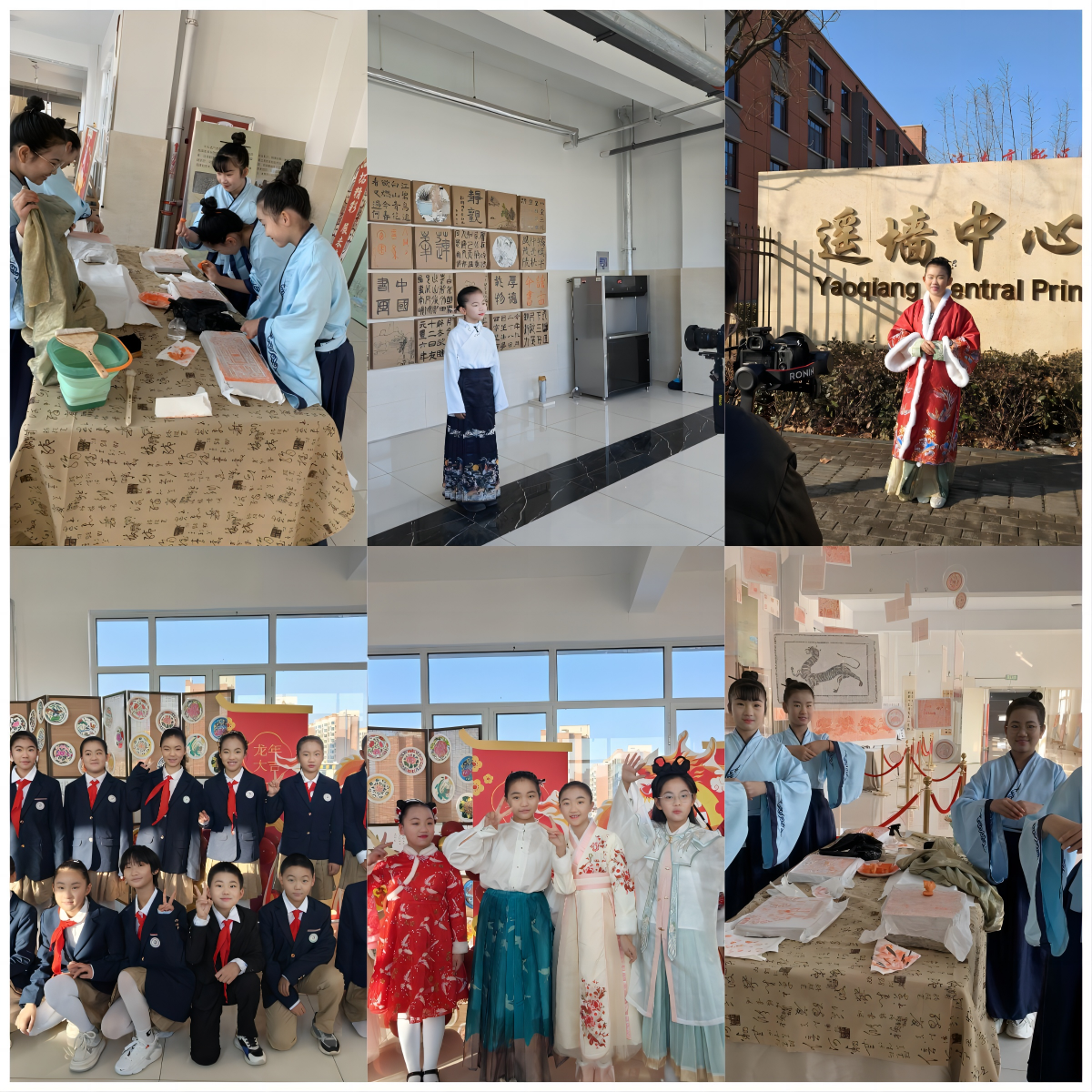 首先,我们的小小讲解员在校门口和九曲广场前讲解了我校开展的一系列弘扬传统文化活动,并简单介绍了大寒节气。接下来,同学们在艺术连廊亲身体验了传统书法、拓印以及丰富多彩的画作。